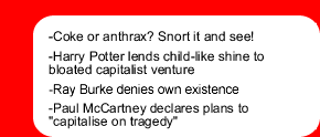 Celebrities backstage watched in appalled silence as Bono began to slowly rise skywards, a halo appearing above his head. "I am a son of God and finally my heavenly Father has called me to his Kingdom for all eternity. My work here on Earth is done and I must go now". He urged onlookers not to cry for him citing the fact that all nirvana awaited him. "You must be strong, it will be a lonely and desolate time for humanity in my absence." Bono is well known for his work in the field of collaborative charity records, including his recent top ten hit for New York City and AIDS. He is also well recognised for his dedication to the cancellation of Third World debts through the meeting of G8 leaders. Speaking earlier this year in Genoa, Italy, he said, "All you funky kittens must meow with me in biting the economic leopard that sucks from all my brothers in Africa. It's like they (Third World countries) took in the First World and let them flourish with their natural resources - and this is how they repay them, with debt. It's all imaginary, not tangible like, like my tax contribution". Bono left instructions for a large monument to be built in his honour akin to the statue of Jesus in Rio de Janeiro, promising to return again. "I will rise again and join my disciples (U2) for another world tour when I know that my work on earth has come to its full realisation," he told a crowd of weeping B list celebrities. Meanwhile, Third World debt continues to rise and a further round of World Trade Talks begins this week in one of the world's poorest countries. Seven out of ten people will die of AIDS in the coming two decades and drug companies refuse to provide the necessary medicine. "Just think how much better off he left the world", sobbed P. Diddy.