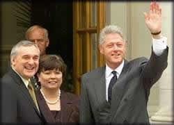 The Clinton presidency may be over, but the people of Ireland have not forgotten all the hard work he put in for our country, raising the profile of Ballybunion golf, recommending the Corrs to the other leaders of the G8, and of course pitching in with the peace talks. For a long time, the government has tried to come up with an appropriate gift that would represent both Ireland's historic past and her present aspirations, as well as appealing to Clinton's effervescent personality.So it was with great pleasure yesterday that Taoiseach Bertie Ahern revealed the plan to hand over twelve of our ripest, most bountiful young virgins to Clinton for his own personal use. In a moving ceremony outside Aras an Uachtarain, the dozen comely young maidens were unveiled before a surprised and delighted Clinton, who had been invited to Ireland under the pretext that "there might be a breakthrough in the negotiations in the North"(!). "How did you know?", cried a visibly moved Clinton, wiping tears from his eyes and pushing onlookers out of the way. "It's just what I've always wanted". "There's more where they came from, Billy", said a magnanimous Ahern. "Just say the word". |